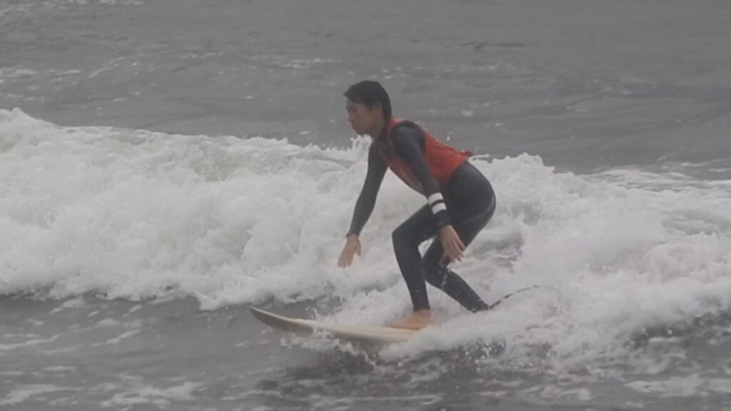 BEACHのサーフィンスクールでは、インストラクターがうしろから押さない実践式のスクールを行っています。