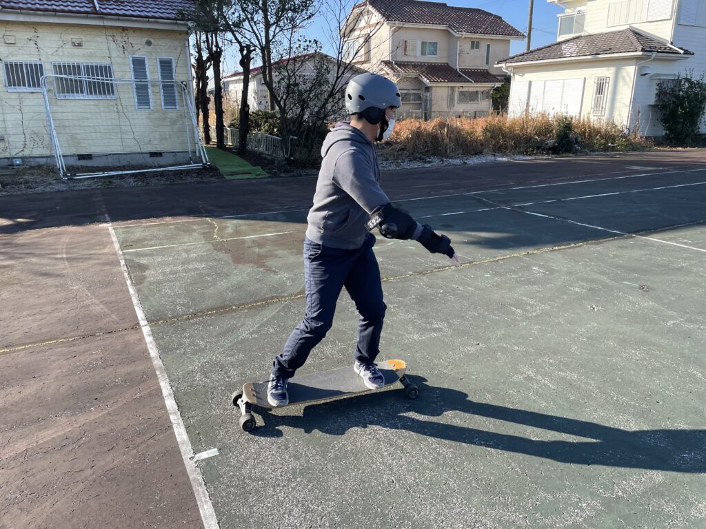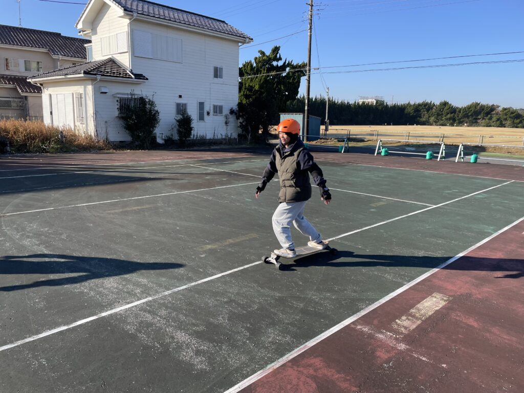 今日のレッスンはスケボーからのスタート! 朝の冷えた体を温めつつ、ボードコントロールの反復練習です。