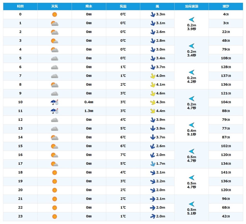 風はやや強めの北~北西の予報です。
