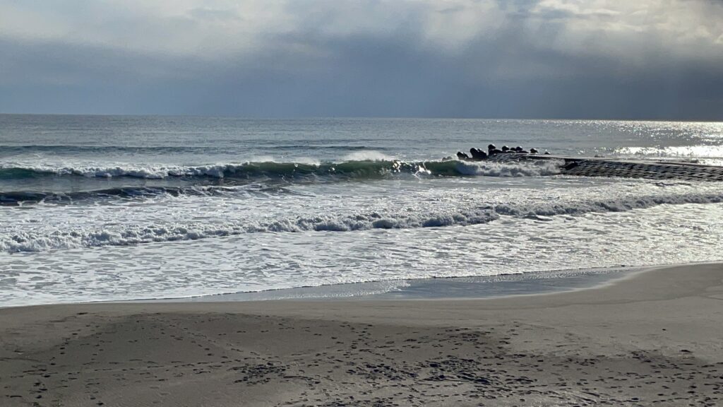 弱い北西風が吹いていて堤防の左側はややザワつき気味。 右側はクリーンですがうねりの反応は弱く、腰前後のサイズになっています。