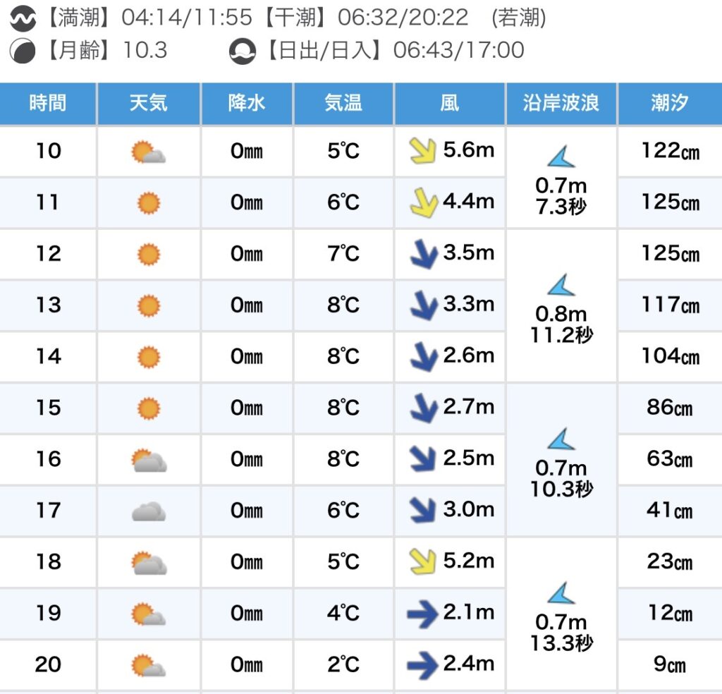 日中にかけては徐々に北西風が収まり、夕方には西風へと変わります。 うねりは概ね変化なく、腹前後のサイズは残るでしょう。 潮の引いている夕方がねらい目です。
