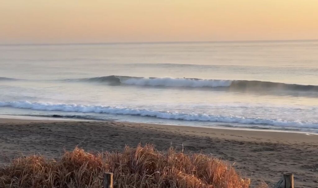 今朝のサイズは腰~腹前後です。 風は無風で海面はクリーンとなっています。 ピークワイドにダラついたブレイクで、 切れ目から1アクション程度でしょう。