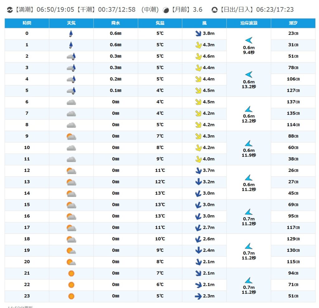 風はやや強めの北西に始まりお昼過ぎから北東にシフトする予報。