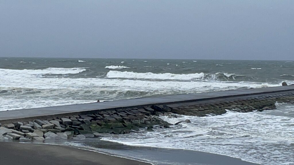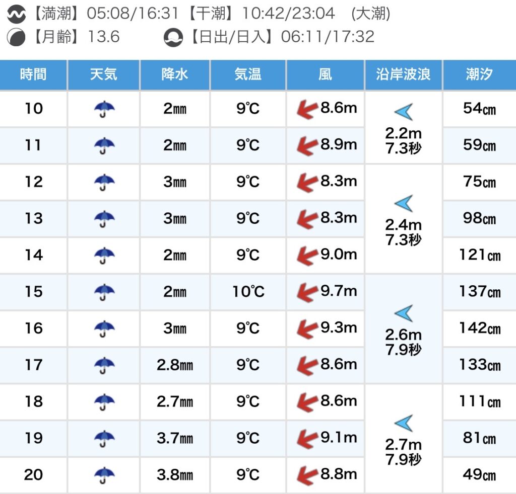 今朝のサイズは肩~頭前後です。 非常に強い北東風が吹き、クローズとなっています。