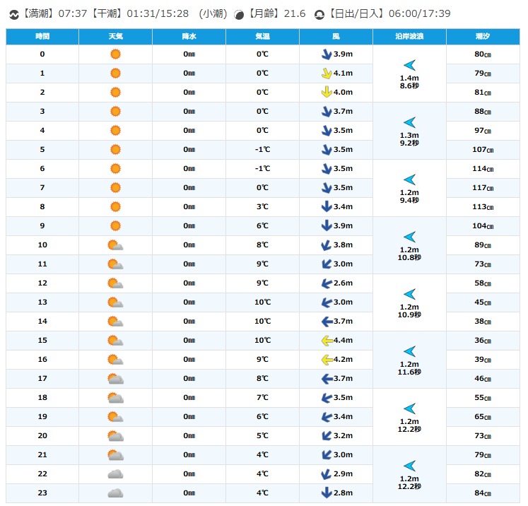 風はやや強めの北西に始まりお昼頃から北東にシフトする予報。